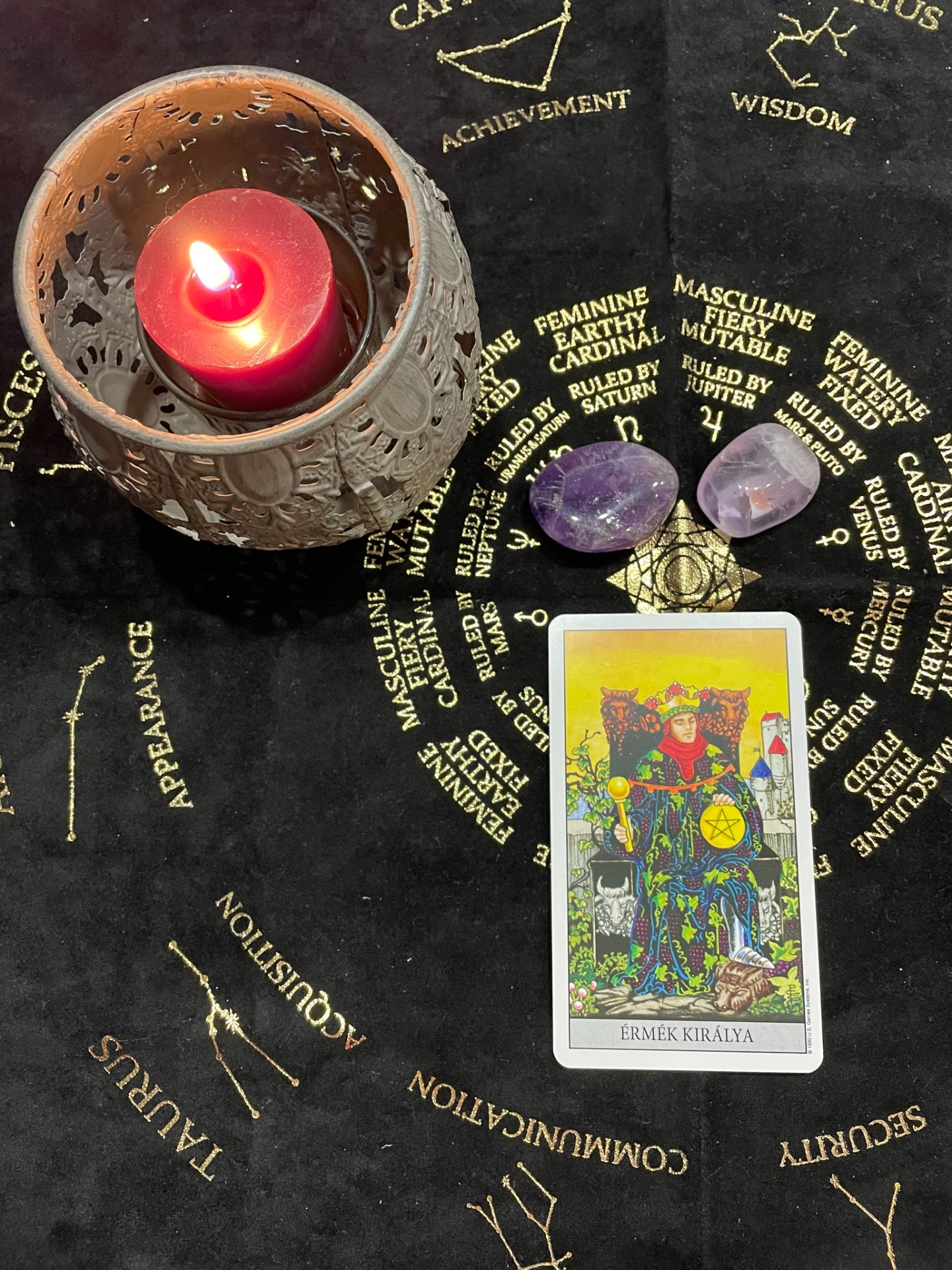 A jövő hét energiáit az Érmék királya jellemzi. Ez nem is rossz: múlt héten a Kelyhek királyát, most pedig az Érmék királyát húztam. Míg egy héttel ezelőtt az érzelmek domináltak, a jövő héten az anyagiak fognak. Ez alatt ne csak a pénzt értsétek, hanem minden olyan dolgot, ami a biztonsággal, a stabilitással, állandósággal kapcsolatos. Így már kicsit másképp hangzik, ugye?A lap felhívja a figyelmet arra, hogy tegyünk a vágyainkért, cselekedjünk, ne várjuk, hogy a siker és a jólét az ölünkbe hulljon. Az Érmék királya jelzi a munkákban lelt örömet, sikert, a türelmet és a kitartást, ami ezek eléréséhez kell. Ez a lap kifejezi az örömök keresését, az életet élvező embert, aki meglátja a szépet és a jót a körülötte lévő dolgokban. Jelezheti egy gyakorlatias, megbízható, biztonságot sugárzó férfi megjelenését is, de azt is, hogy lehet, hogy Te fogsz így cselekedni a jövő héten.